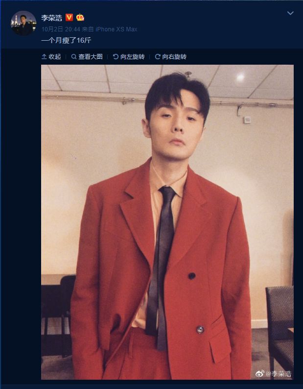 10月2日晚,李荣浩在微博上晒出一张自拍,配文“一个月瘦了16斤”。照片中,李荣浩红色西装略显松松垮垮,的确清瘦不少,他的这条微博也遭网友评论“因为要准备婚礼了吗李老师?”据悉,2017年9月16日,杨丞琳现身李荣浩台北小巨蛋演唱会,俩人正式公布恋情;2019年7月11日,杨丞琳在李荣浩34岁生日之际接受了他的求婚;2019年9月19日,杨丞琳李荣浩发微博承认已经于17日领证结婚。