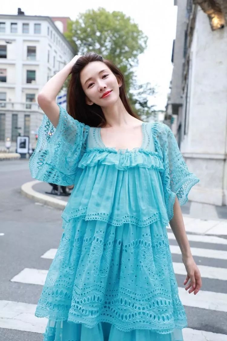 2、44岁林志玲漫步米兰街头 穿粉蓝色长裙格外仙美