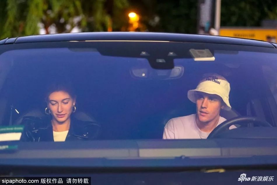 16、比伯婚后开车载妻子约会 海莉穿皮夹克见镜头忙遮挡面容