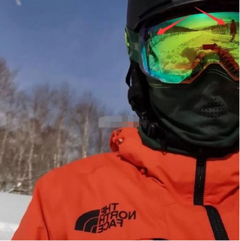 而后网友晒了一张照片,但照片里并不是谢霆锋和王菲,而是网友用谢霆锋一张护目镜反光的照片,以箭头分别标注了反射出的两人,其中一个正是王菲。