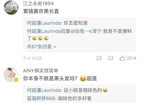 7月,何超莲在微博上晒出了自己染了黑发的照片,并称:“人生中第一次黑头发”。很快,她的这条微博内容就被眼尖的网友发现,何超莲之所以染了黑色头发正是因为窦骁曾说过自己喜欢头发又黑又直的女孩子。所以,为了讨男友欢心,从出生就是咖啡色头发的何超莲第一次尝试了染黑发,着实是很有心了!