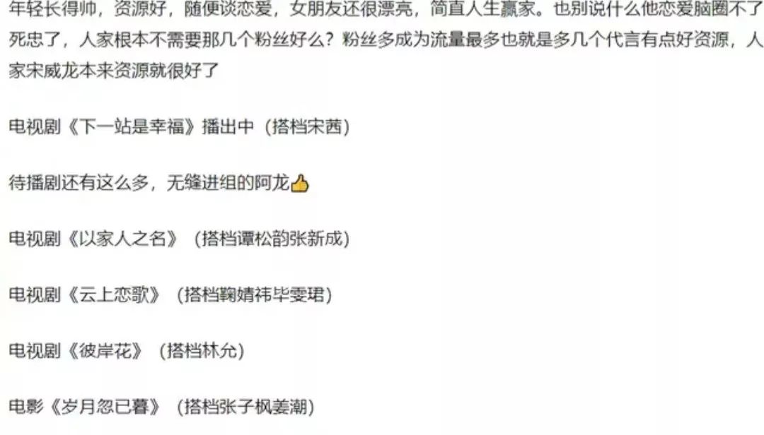 但宋威龙依旧得于正的看重,在公司的新春祝福中于正可是把宋威龙送上第三位,在资源方面也丝毫不吝啬,宋威龙与谭松韵、张新成合作的《以家人之名》正在拍摄中,两人的路透吻戏被网友晒到网上也是一波齁甜的操作,谭松韵与张新成的演技在新生代青年演员中能拔得头筹的吧!“爆款”预言一下吧!