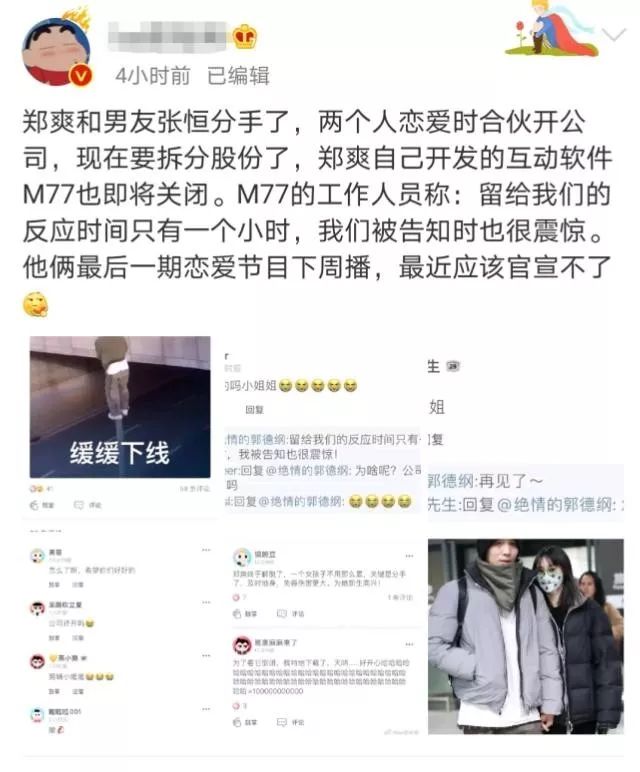 但就在昨天,突然网曝郑爽和张恒已经分手了,两人恋爱期间合开的公司正在准备拆分股份,郑爽在恋爱期间开发的M77软件也关闭了。