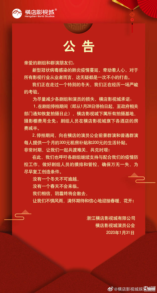 一、在剧组停拍期间(即从1月28日停拍日起,至政府相关部门通知恢复拍摄日止),横店影视城下属所有拍摄基地、摄影棚费用全免;剧组人员在横店影视城旗下各酒店的房费减半。