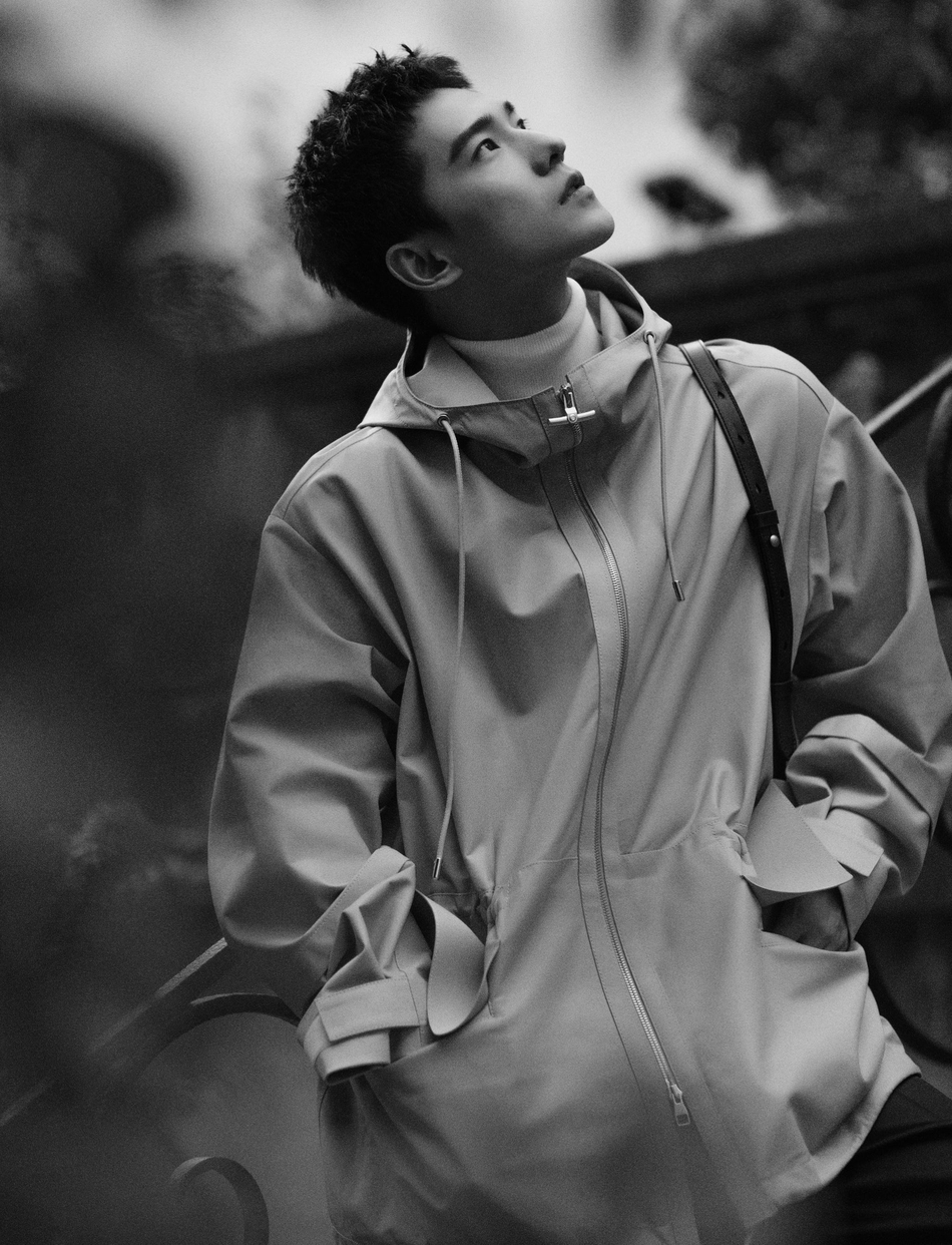 男友风写真曝光,他身穿皮革派克夹克搭配白色高领衫,俊朗清逸少年感十足。