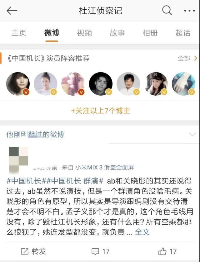 估计杜江也是对这样的情节设定有些争议,在网友发布了质疑孟子义的影评之后,杜江居然在微博上点赞了这条说孟子义角色的微博,看来搭讪孟子义的“杜机长”也有些“被迫营业”的原因啊。