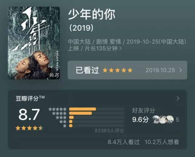 《少年的你》显然获得了首日绝大部分人的认可。其中有明星粉丝,有路人影迷,也有读娱君这样抱着评论目的而来的旁观者——但似乎毫无例外的,《少年的你》击中了不同观影目的观众的内心。