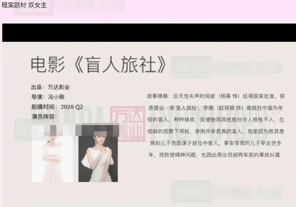 网友曝光的冯小刚新片名为《盲人旅社》,以两位女性人物为主角展开故事,属于略带悬疑色彩的现实题材电影。这位网友不仅曝光了片名和剧情梗概,就连主演阵容和拍摄时间都一并公开,说得有鼻子有眼煞有其事的样子。