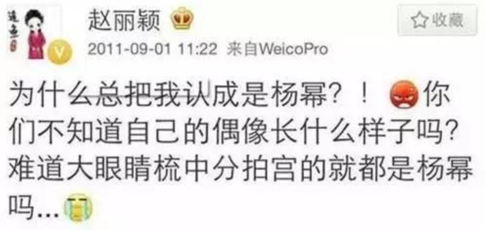 多次被路人误认为杨幂,让赵丽颖深受困扰,忍不住发微博公开怼网友:“为什么总把我认成杨幂?你们不知道自己的偶像长什么样吗?”虽然赵丽颖随即又发了一条微博,解释自己并无恶意,但粉丝之间却已经结下了梁子。
