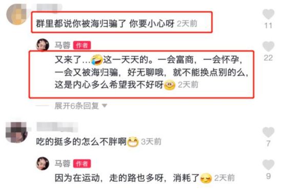 马蓉和王宝强离婚后,关于她新男友的消息一直层不出穷,前段时间有网友爆料,称她的现任男友是一名冒牌海归,还惨遭对方骗财骗色,这次马蓉直接通过回复网友留言表示否认。