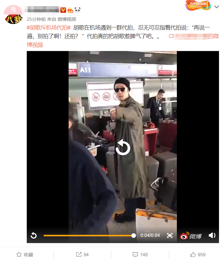 11月8日下午,微博上突然流传出一段胡歌在机场怒斥代拍的短视频引起网友热议。