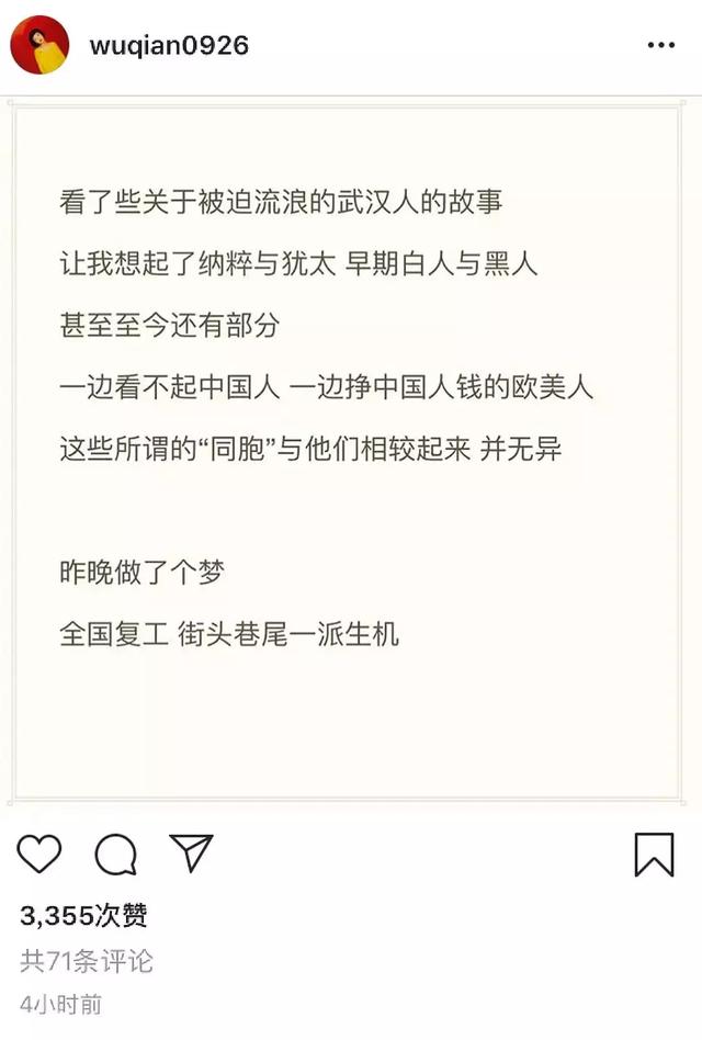 而比起热巴跟杨紫,下面这位就更具争议了。在疫情时期,很多明星纷纷发声助力,90后小花吴倩是土生土长的武汉人,这次她格外关心家乡的疫情,最近更是在ins发文表示支持武汉。
