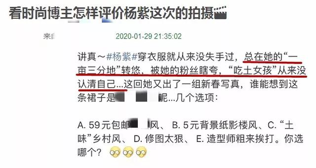 然而杨紫这次的装扮再次被大V点名批评了,认为其穿搭数次失手,裙子和鞋子明明是某高奢品牌,硬是穿出了某宝影楼风,连带着网友的评价也不太友好。杨紫服装踩雷不是一两次了,看来杨紫和其工作室确实要注意这方面的问题啊。