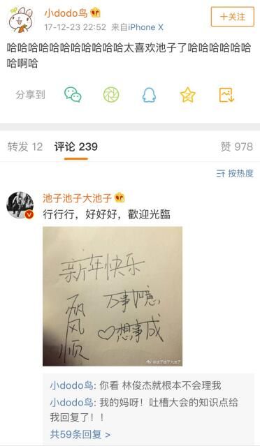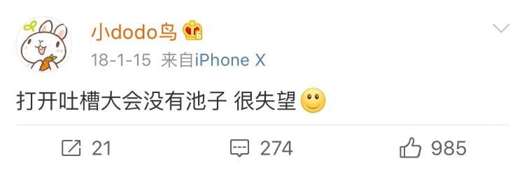2018年1月,豆得儿又一次在微博中提到了池子。表示:打开吐槽大会没有池子,很失望。看来早在那个时候豆得儿就已经被池子这个有趣的灵魂给吸引了!