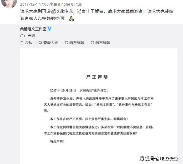 可偏偏在2017年10月,任娇在酒店坠楼身亡,而杨旭文与任娇之间的关系,以及究竟为何死亡,杨旭文都有着莫大关系,不过最后澄清称与杨旭文无关,但这并不能消解网友的猜测和疑虑。为此杨旭文工作室还发了声明,警告严禁传播不实信息。