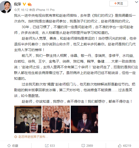 原标题:倪萍哀悼赵忠祥称其是主持人里的宗师,网友:业界泰斗,无人