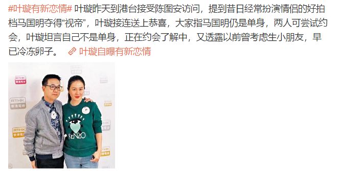 近日叶璇在接受媒体采访时,再一次谈到了自己新恋情。因为叶璇的好朋友马国明夺得“视帝”,两人又多次扮演荧幕情侣,记者在采访时提到两人都是单身可以尝试约会。但叶璇却坦言自己不是单身,目前正在与人约会。