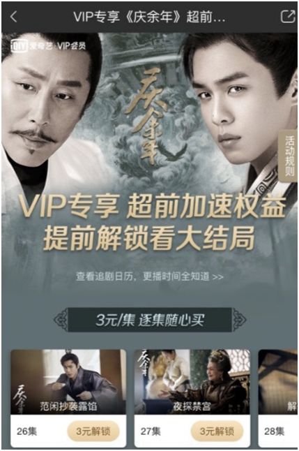 12月17日,腾讯视频、爱奇艺纷纷修改超前点播规则,腾讯视频会员可提前看6集权益不变,但可享额外3元每集的超前点播权,不再是支付额外50元观看6集的设定。爱奇艺同样修改了超前点播规则,VIP可在提前观看6集的基础上,以每集3元的价格再多看6集。