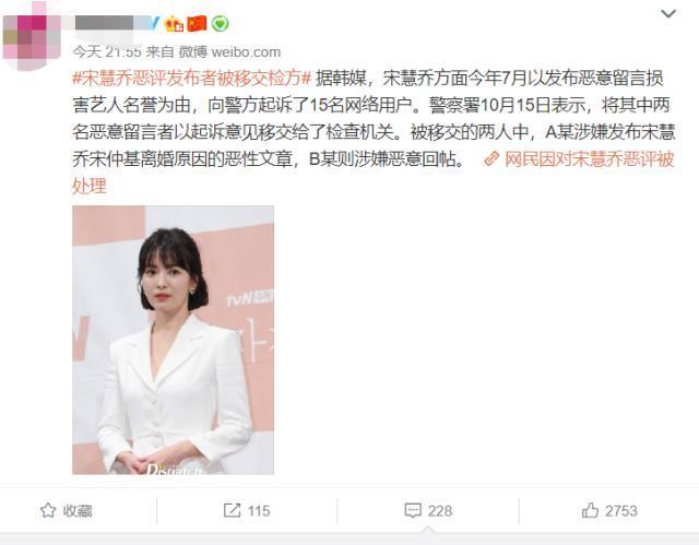 10月15日,据韩媒报道,宋慧乔方面今年7月以发布恶意留言损害艺人名誉为由,向警方起诉了15名网络用户。警察署表示,将其中两名恶意留言者以起诉意见移交给了检察机关。被移交的两人中,A某涉嫌发布宋慧乔宋仲基离婚原因的恶性文章,B某则涉嫌恶意回帖。