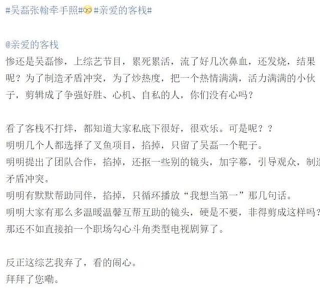 可以说,节目组的这些剪辑操作让曾经给过大家温暖的《亲爱的客栈》早已变味。但对于观众来说,比起平淡如水的日常,节目组为了话题而制造事端更让人不喜,美好的田园生活才是大家的心之向往。