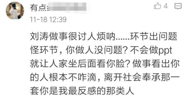 1月18日,饱受质疑的刘涛突然在网络上回应了一位网友的评论,这位网友发博吐槽称《亲爱的客栈3》中刘涛太讨人厌了,觉得她做人有问题,员工不会做PPT就让人坐到后面一直看她的脸色。