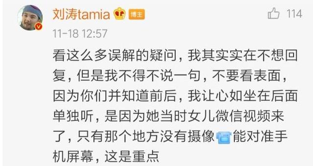 但现在据刘涛回应的来看,当时她让林心如坐在后面单独听并不是因为迁怒,而是因为林心如的女儿发来了视频,只有沙发区那一块没有摄像机能对准手机屏幕。