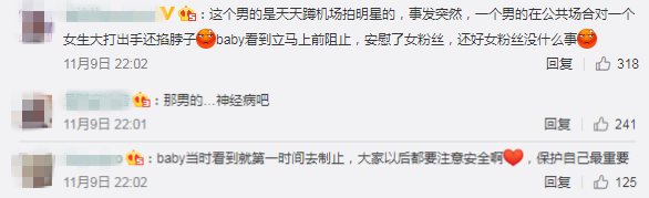 而baby也被突发的一幕吓到了,但她直接上前进行了制止并拉开了男子,接着baby还走到女孩面前,安慰粉丝。