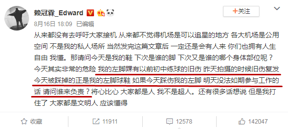 而他的左脚踝曾有初中练球时受过伤,前一天旧伤复发,不想又被粉丝踩中。他不得不发声,呼吁粉丝不要接机:“将心比心,大家都是人,我不是超人。”
