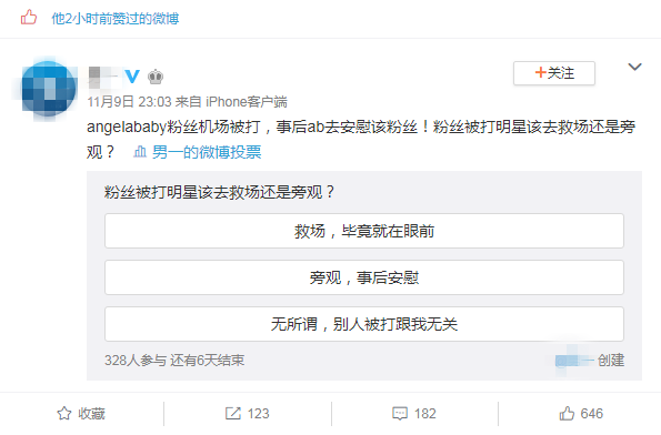 baby粉丝在机场被打在9日晚上发酵后,他还赞了网友关于粉丝被打明星该去救场还是旁观的投票贴。