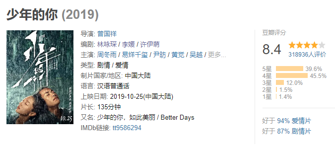 而导演曾国祥在《七月与安生》之后,再次展露其导演才华,无论从故事节奏、镜头调度等方面都有非常出色的表现,而和他合作过的周冬雨这一次演技大爆发,易烊千玺的表现也让观众意外,豆瓣拿到8.4的高分也在情理之中了。
