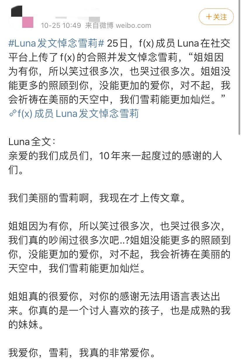 今早,f(x)成员Luna在个人社交平台上上传了一张f(x)五位成员的合照,并发了一段文字悼念雪莉,其中她写道:“姐姐因为有你,所以笑过很多次,也哭过很多次。姐姐没能更多的照顾到你,没能更加的爱你,对不起,我会祈祷在美丽的天空中,我们的雪莉能更加灿烂。”
