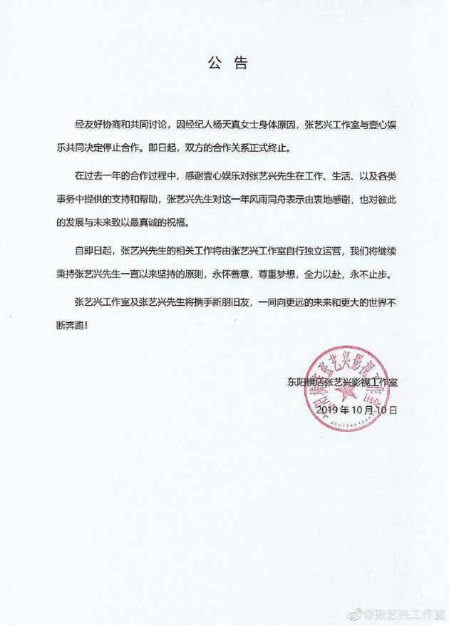 杨天真也透露自己接下来的规划,她将暂停一部分工作,认真调养身体。张艺兴迅速转发杨天真长文,写到:“谢谢你,胖杨,照顾好身体,招呼好自己。”张艺兴工作室随后官宣,张艺兴日后工作都由其工作室独立运营。