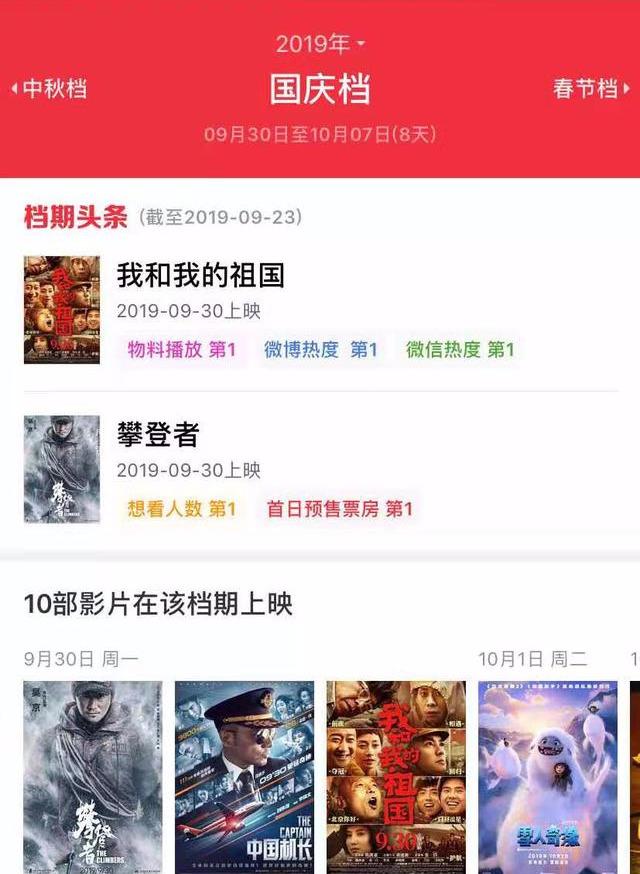 国庆长假如期将至,正逢新中国成立70周年之际,兼具文化传播重任的影视行业献上了三部庆祝祖国生日的电影:《我和我的祖国》,《攀登者》和《中国机长》。第一部《我和我的祖国》“再现”新中国成立以来的7次重大历史瞬间,第二部《攀登者》聚焦1960年和1975年两代中国运动运勇登珠峰的事迹,第三部《中国机长》讲述2018年5月14日“中国民航英雄机组”成员与119名乘客遭遇极端险情等多重考验的故事。