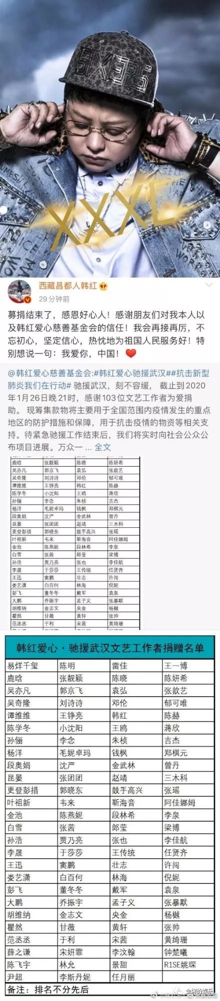 近日,韩红更新捐款名单上了热搜引发热议,原来是韩红号召多位明星为抗击新型肺炎捐款,各路粉丝、路人互相开撕,一个说这个捐得少,一个说另一个明星怎么没捐……评论里戾气飙升。