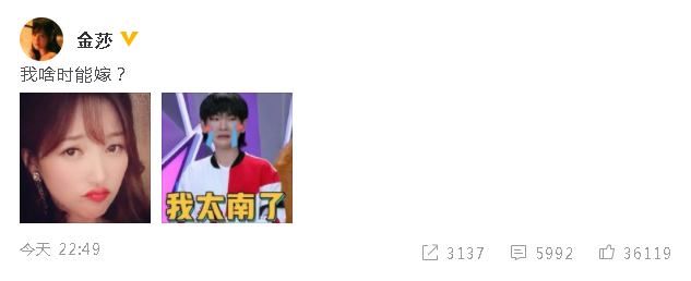 原标题:36岁歌手金莎发文“我啥时能嫁”引热议,女明星为何都