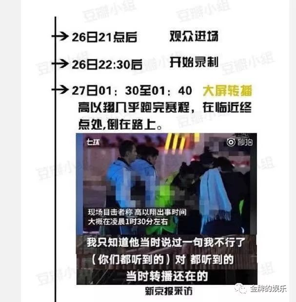 《追我吧》节目是26日21点后观众才能进场,22:30分开始录制,就在27日凌晨1:30到1:40大屏幕才转播高以翔几乎快跑完全程了,在临近终点有观众听到高以翔大喊我快不行了,然后倒在地上。