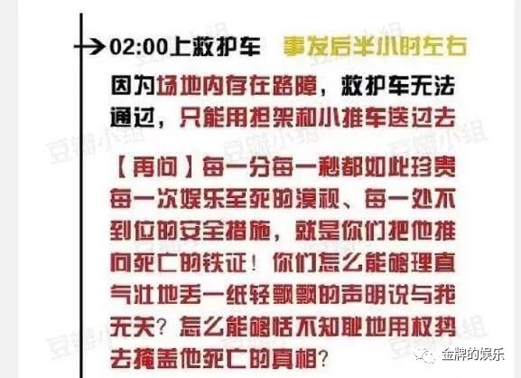 高以翔事发后救护车也是因为场内路障的原因,救护车无法开到场内,只能通过担架和小推车运送,如此珍贵的每一分每一秒,也是被白白的浪费了,每一次娱乐至死的漠视、每一处不到位的措施,就是你们把他推向死亡,最后得到的却是一纸轻飘飘的声明说与我无关?怎么能够恬不知耻的用权势去掩盖他死亡的真相?