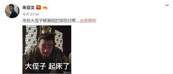 但作为电视剧的主演,不管怎样都要为自己的作品宣传。12月18日,朱亚文和俞灏明两人就在社交平台进行一波互动,引发了网友们的讨论。朱亚文先发了一条动态,调侃“来自大侄子被凝视的惊恐日常”,配图是俞灏明饰演的朱高煦在喊朱瞻基起床。
