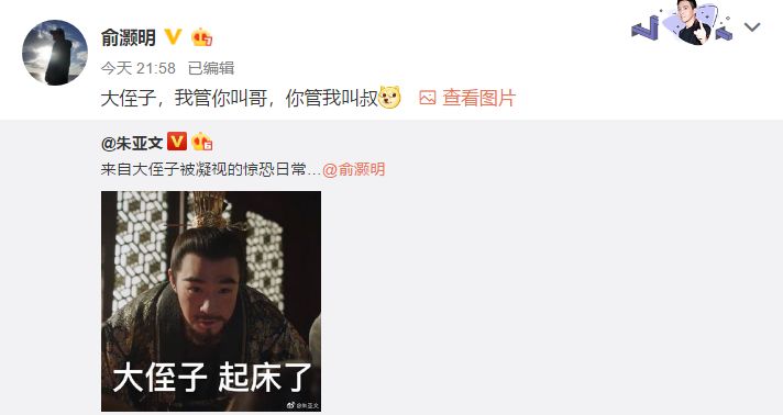 俞灏明转发回应“我叫你哥,你叫我叔”,配图是朱亚文饰演的朱瞻基惊醒后的表情。两人互动有趣的点其实不在表情包,而在俞灏明是1987年生人,朱亚文则是1984年生,俞灏明比朱亚文小3岁,却在剧中饰演朱亚文叔叔。