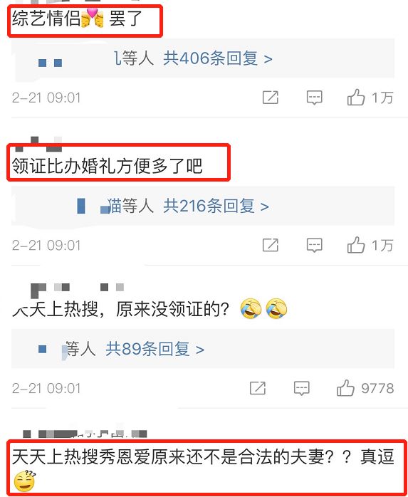 还有引来了网友嘲笑声,表示:“领证比办婚礼方便多了,天天上热搜原来还不是合法的夫妻,真逗”。