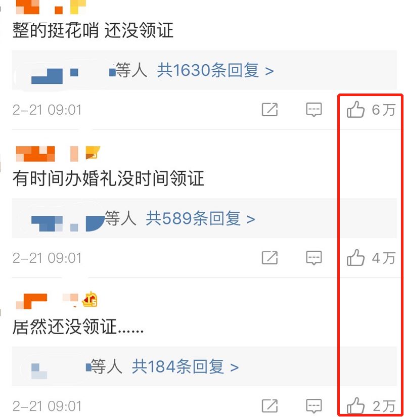 看到这里,网友都留言表示不敢相信,热评的高赞都是几万开头,纷纷表示:“整的挺花俏,还没领证”、“有时间办婚礼没时间领证”、“综艺情侣罢了”......