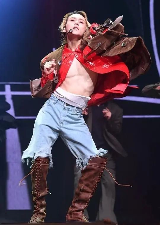浮夸的造型能说是为了舞台效果,但是同样是在抓拍角度之下,金晓钟的颜值完全没办法抵挡住韩媒镜头的“死亡角度”。在唱跳过程中,镜头下的金钟铉不仅皮肤状态像熬了两三天夜的状态,表情管理也仿佛失去了控制。