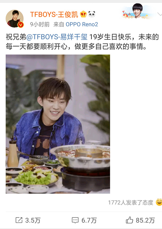 王俊凯在凌晨发文写道:祝兄弟易烊千玺19岁生日快乐。未来的每一天都要顺利开心,做更多自己喜欢的事情。并且还配上了一张千玺吃火锅的照片,照片中,千玺笑出梨涡,显得呆萌可爱,看来就这就是千玺在兄弟心中的样子吧。