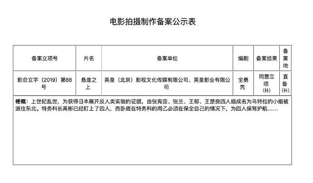 近日,国家电影局2019年8月备案、立项公示出炉,张艺谋的这部新作《悬崖之上》获准立项,备案单位为英皇影视文化传媒和英皇影业有限公司,编剧为全勇先,是2012年热播谍战剧《悬崖》的编剧。从公示的剧情梗概来看,也与《悬崖》颇为相似,片中角色周乙和高彬都和该剧相同: