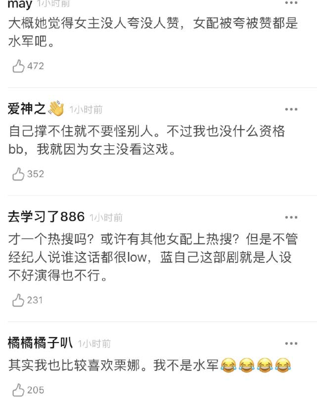 意思就是不管别人怎么上热搜,营销,自己家艺人的位置依然在那里。虽然没有明说是谁,但也有很多网友猜测是在内涵朱珠,从剧开播以来,朱珠确实受到了很多观众。但与此同时,很多网友也表示自己撑不起来女主角,难道还不允许别人出彩了吗?蓝盈莹这一次的角色确实不怎么讨喜,这番话也是挺败好感的。