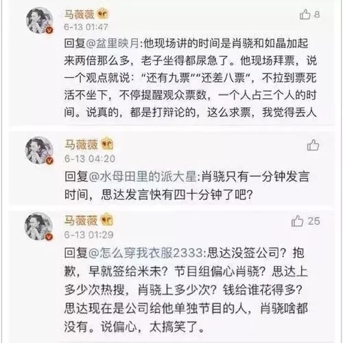 马薇薇突然爆发,在微博发文指责姜思达“现场演讲时间是肖骁和如晶加起来两倍多,老子坐得都尿急了”。之后再度怼粉丝:“节目组偏心肖骁?思达上过多少次热搜,肖骁上多少次?钱给谁花得多?”,“思达有自己单独的节目,肖骁有什么?”。