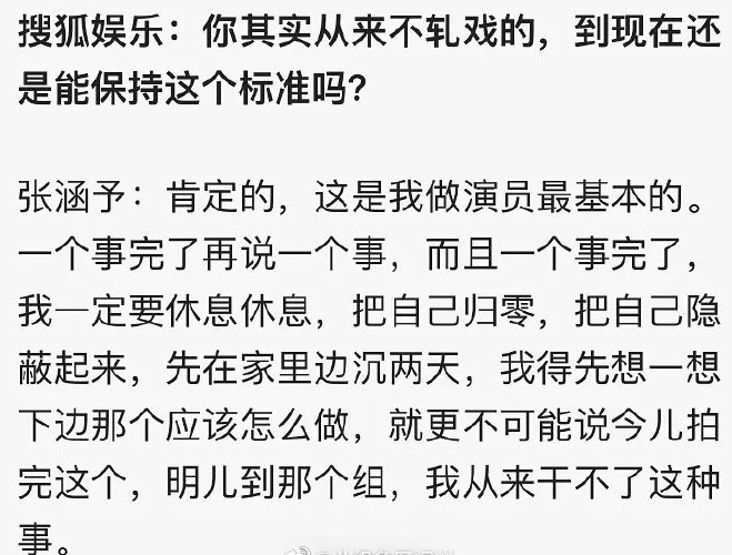而张涵予再接受媒体采访的时候,关于演员演戏,和电影票房的问题是再出金句,媒体问“你其实从来不轧戏的,到现在还是能保持这个标准吗?”结果张涵予说,肯定的,这是他做演员最基本的,一个事完了再说另外一个,而且第一个事情完了,自己还要先沉淀一下,再拍下一部戏,今儿在这剧组拍戏,明天在哪个拍另一个角色,这个事情他是干不来。