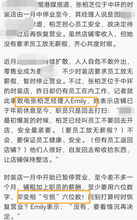 据了解,早在一月中旬,这家位于繁华地带的店铺就因为时期特殊而停业了。当时因为张柏芝的要求,员工们并没有放无薪假。