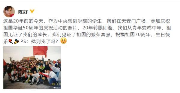 9月30日,陈好更新动态,晒出一张旧照,并配文写道:“这是20年前的今天,作为中央戏剧学院的学生,我们在天安门广场,参加庆祝祖国华诞50周年的庆祝活动的照片,20年转眼即逝,我们从青年变成中年,祖国见证了我们的成长,我们见证了祖国的繁荣富强,祝福祖国70周年,生日快乐。PS:找到我了吗?”照片中,20年前的中戏学生们,手持国旗在天安门前合影留念。