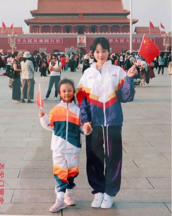 撞色运动装不仅可以修饰不完美的腿型,还很有减龄效果呢。这次母女俩都扎起了高马尾辫,活力满满的样子才是真的好看。手中举着中国国旗,很有运动员的感觉呢。
